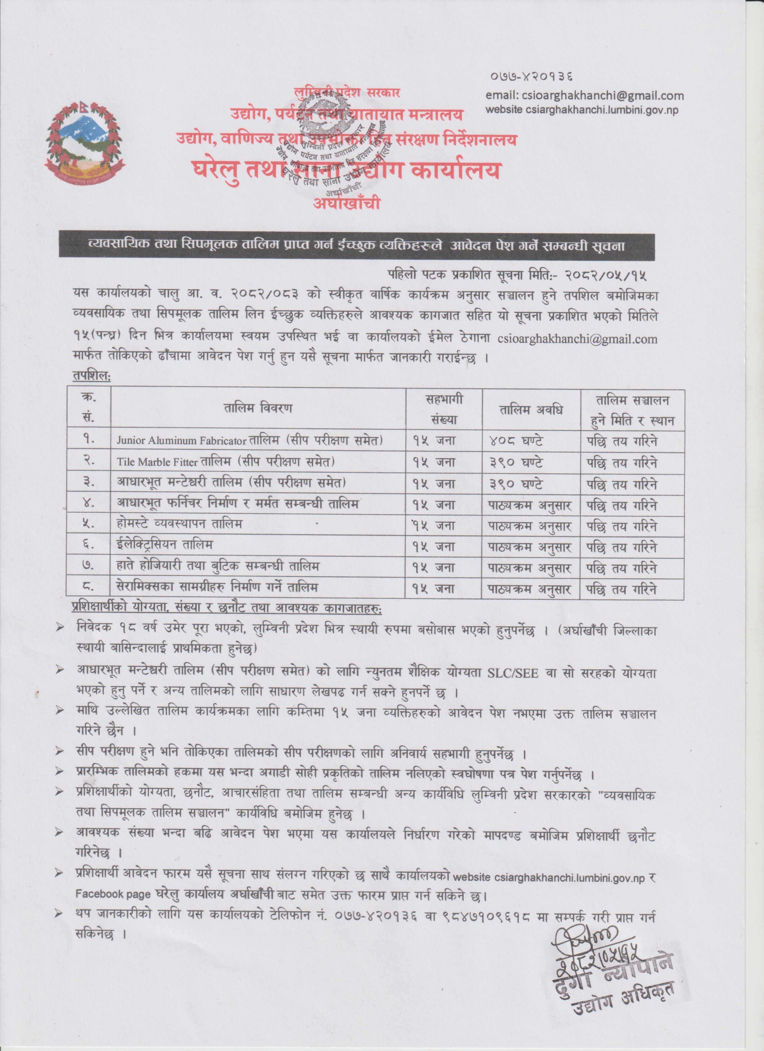 व्यवसायिक तथा सीपमूलक तालिम प्राप्त गर्न ईच्छुक व्यक्तिहरुले आवेदन पेश गर्ने सम्बन्धी सूचना