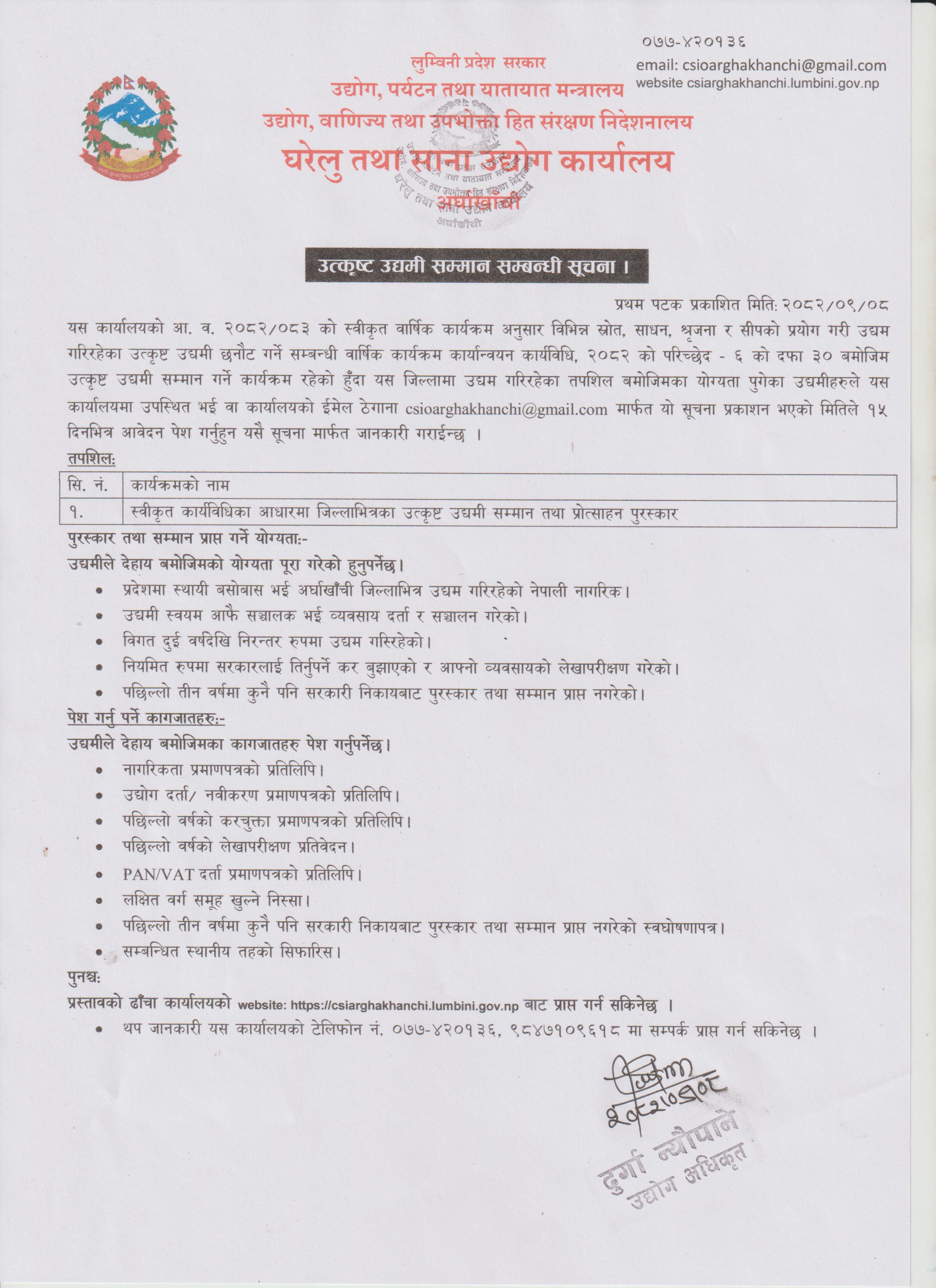 उत्कृष्ट उद्यमी छनौट सम्बन्धी सूचना